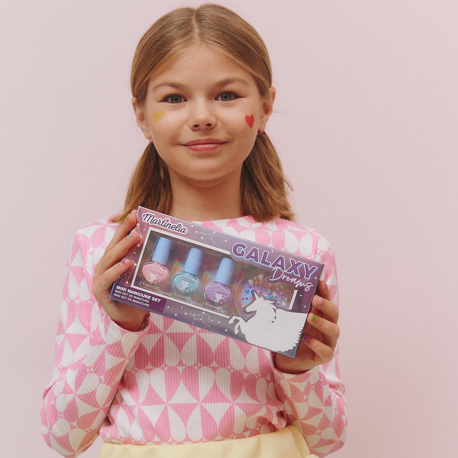 С набором Martinelia Galaxy Dreams для дизайна ногтей девочки научатся делать свой первый маникюр. В набор входит сразу 3 лака для ногтей: розовый, фиолетовый и нежно-бирюзовый.