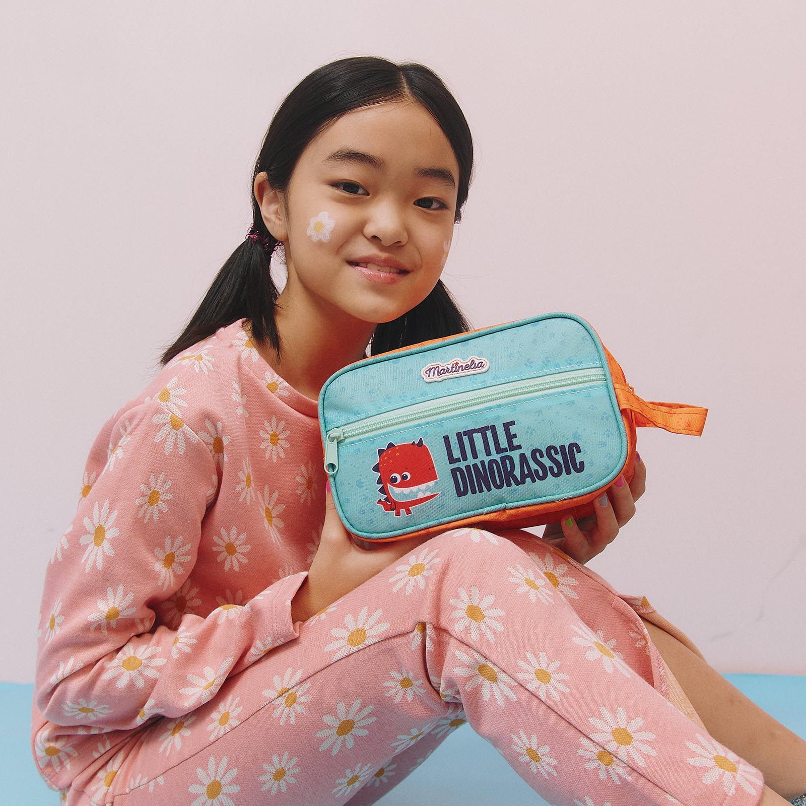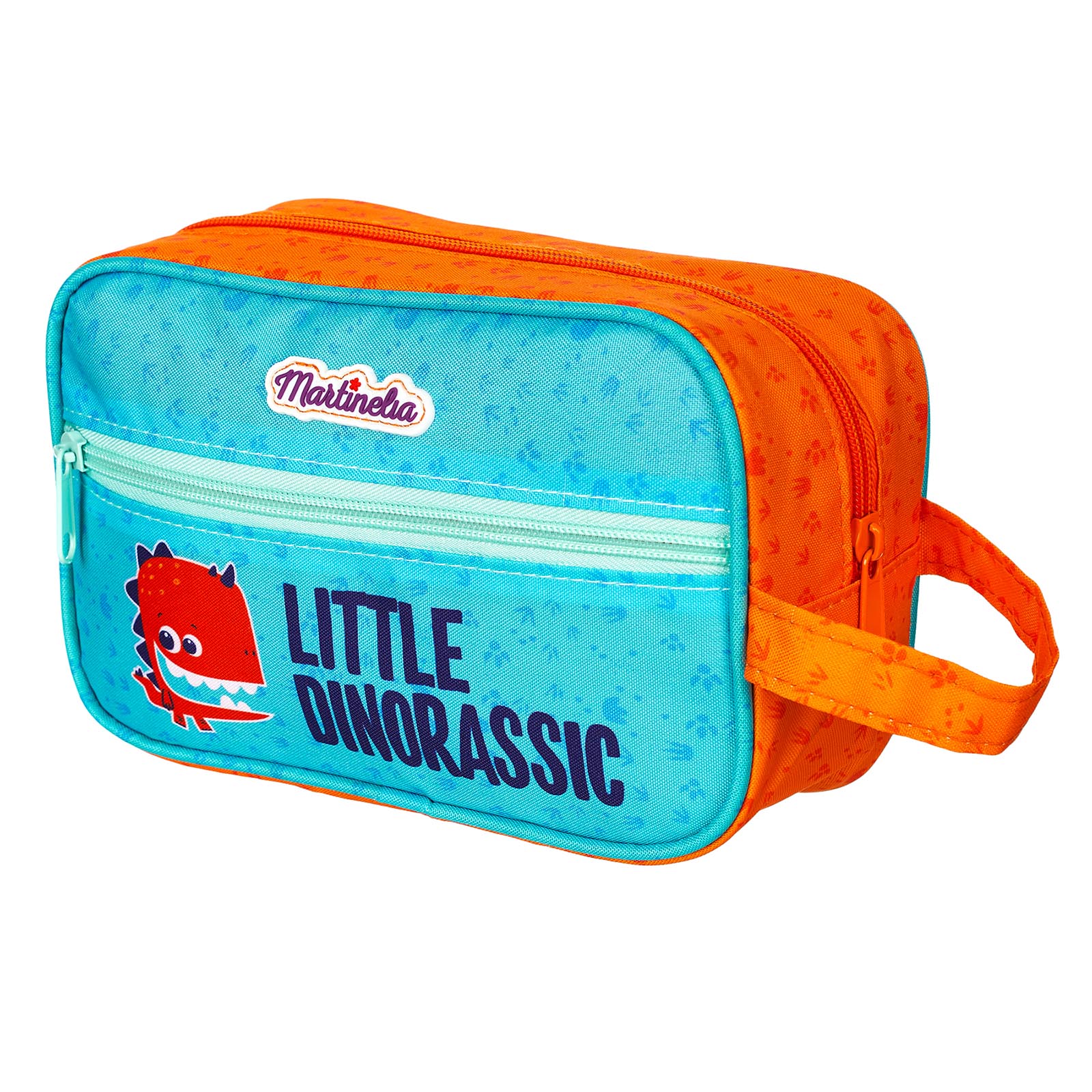Косметичка Martinelia создана для юных любительниц приключений и животных. Смешной динозаврик на сумочке будет охранять вещи своей хозяйки. Сюда можно сложить детскую косметику, чтобы взять ее с собой в гости или на прогулку, а можно использовать как пенал для ручек и карандашей. Косметичка сшита из прочной ткани и снабжена удобной ручкой.