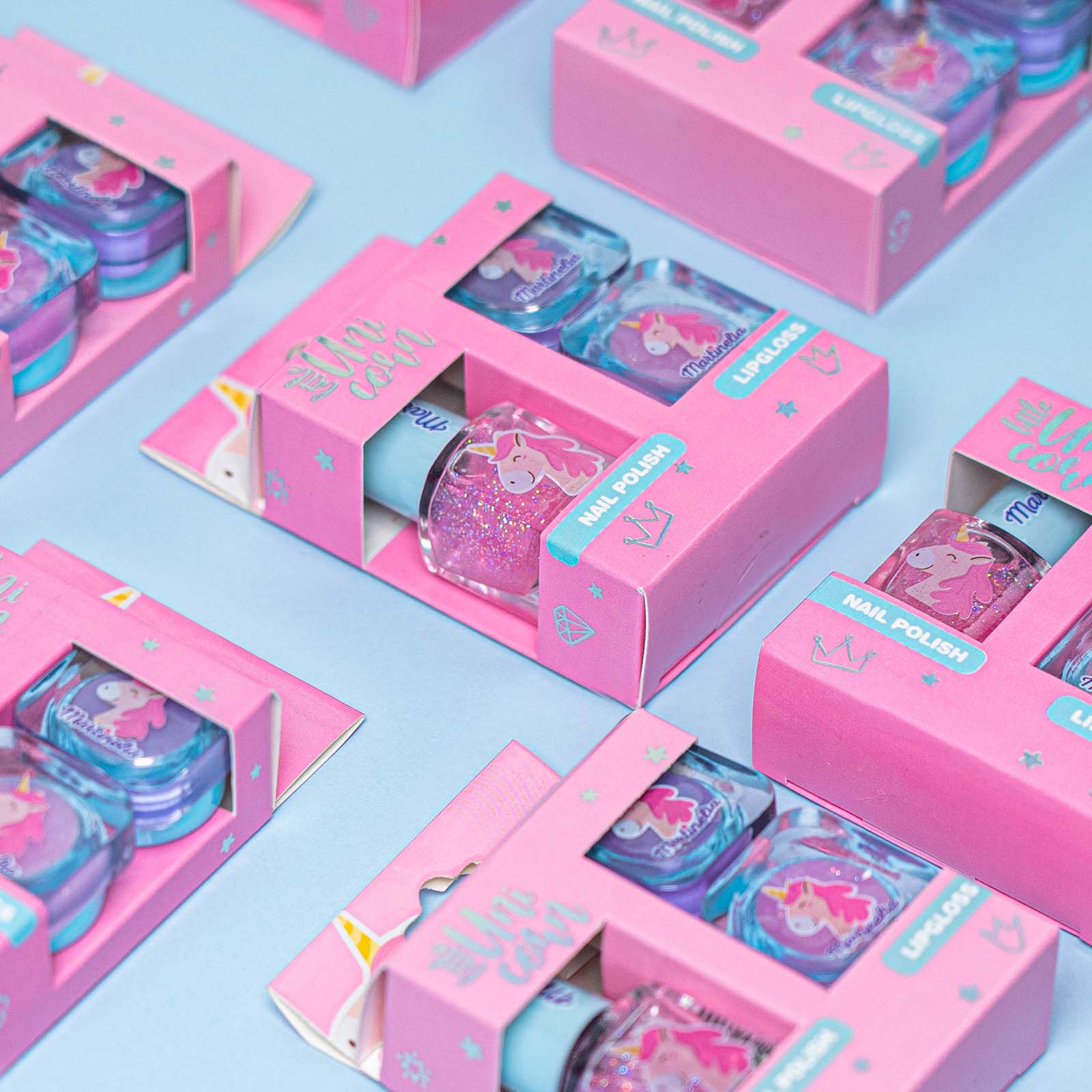 Мини-набор Little Unicorn подойдет для первых шагов в макияже и маникюре. В него входят 2 блеска для губ (один матовый и один блестящий), а также лак для ногтей с блестками насыщенного розового оттенка.