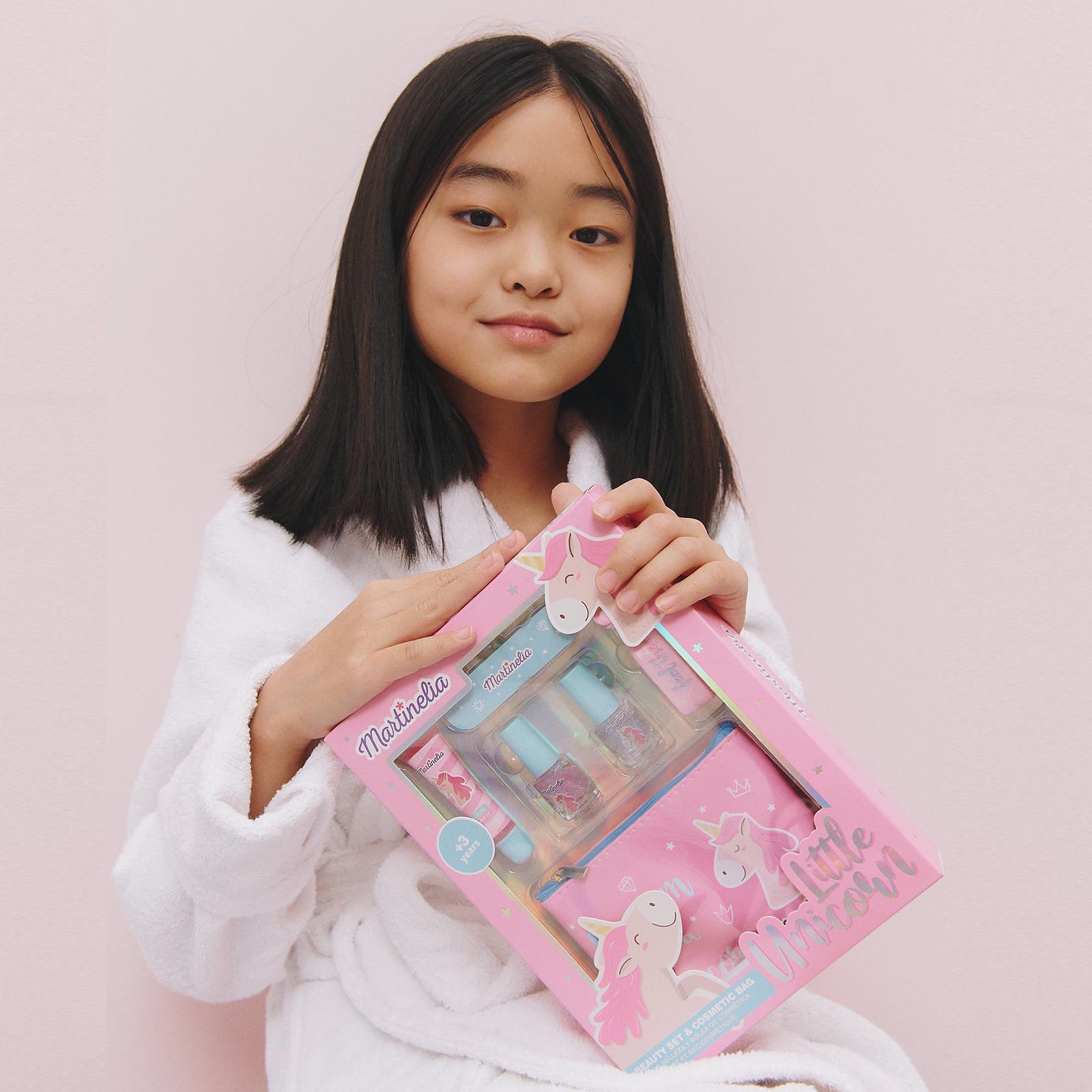 С набором детской косметики Little Unicorn юная модница сможет сделать первые шаги в макияже и научится уходу за ногтями и губами. Он состоит из двух лаков для ногтей разных оттенков (сиреневого и розового), бальзама для губ и пилочки для ногтей. Также в набор входит браслет и милая косметичка с изображением волшебного единорога.