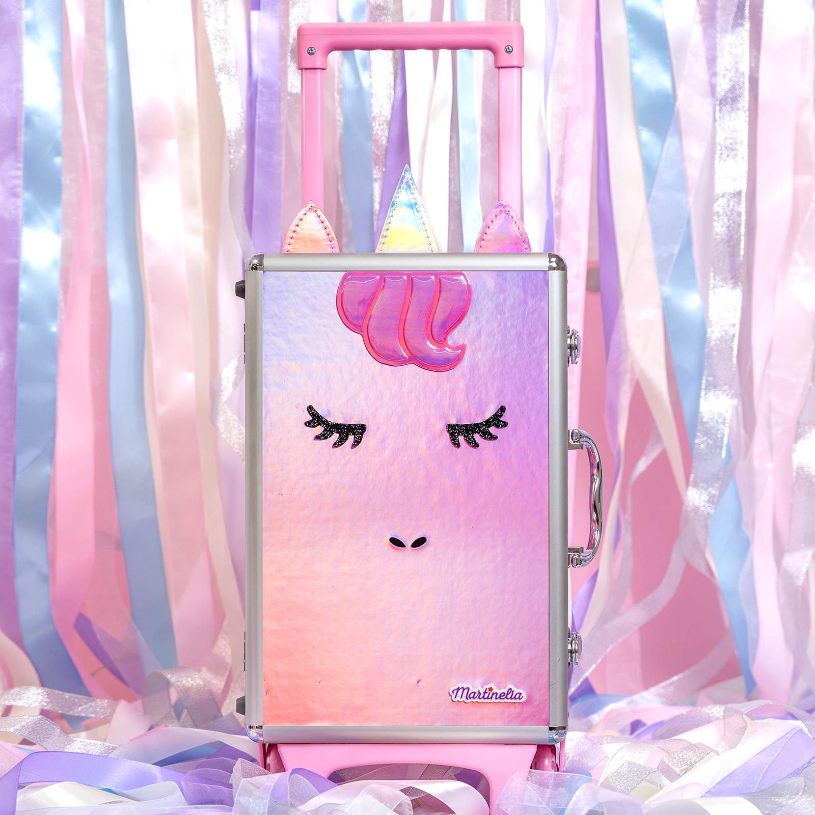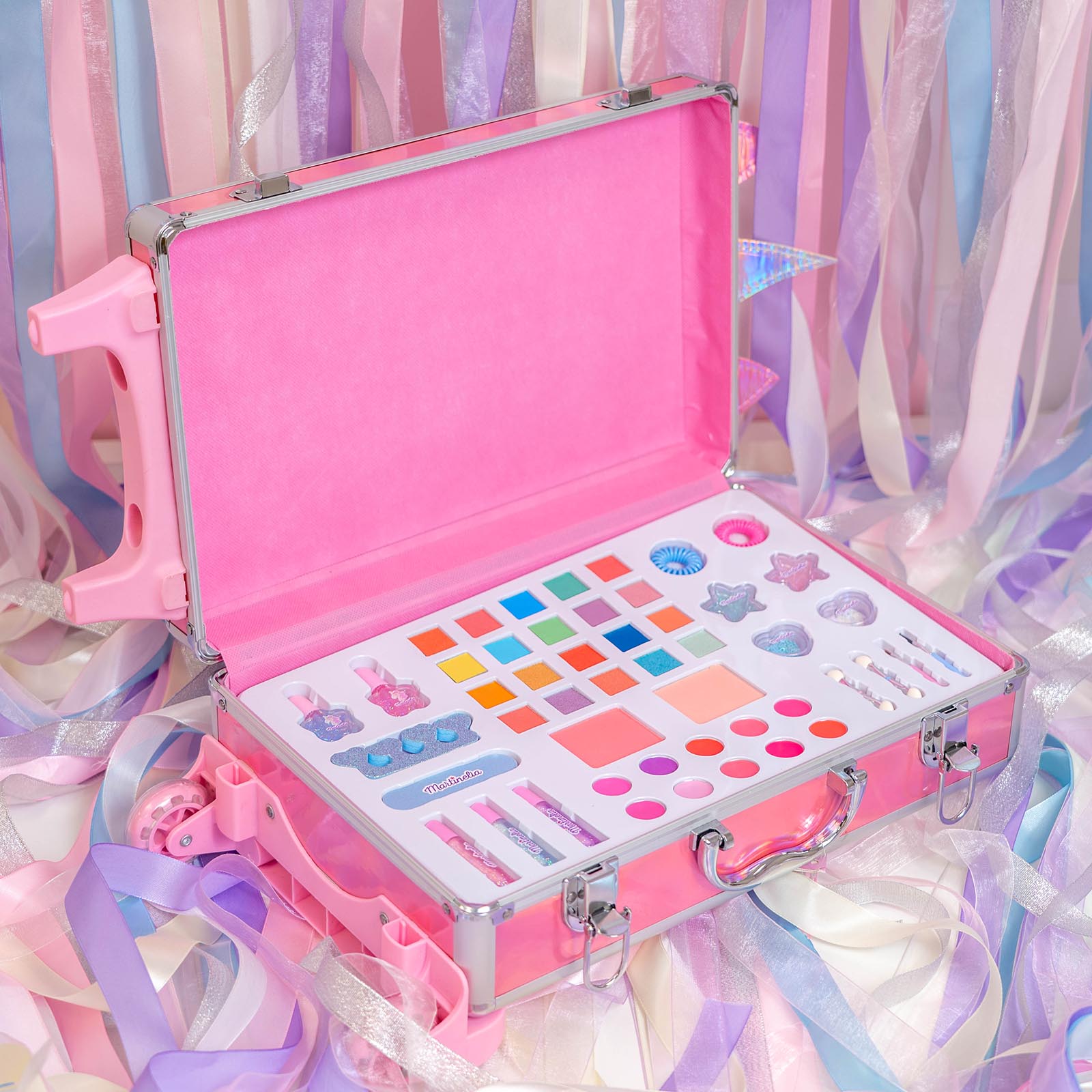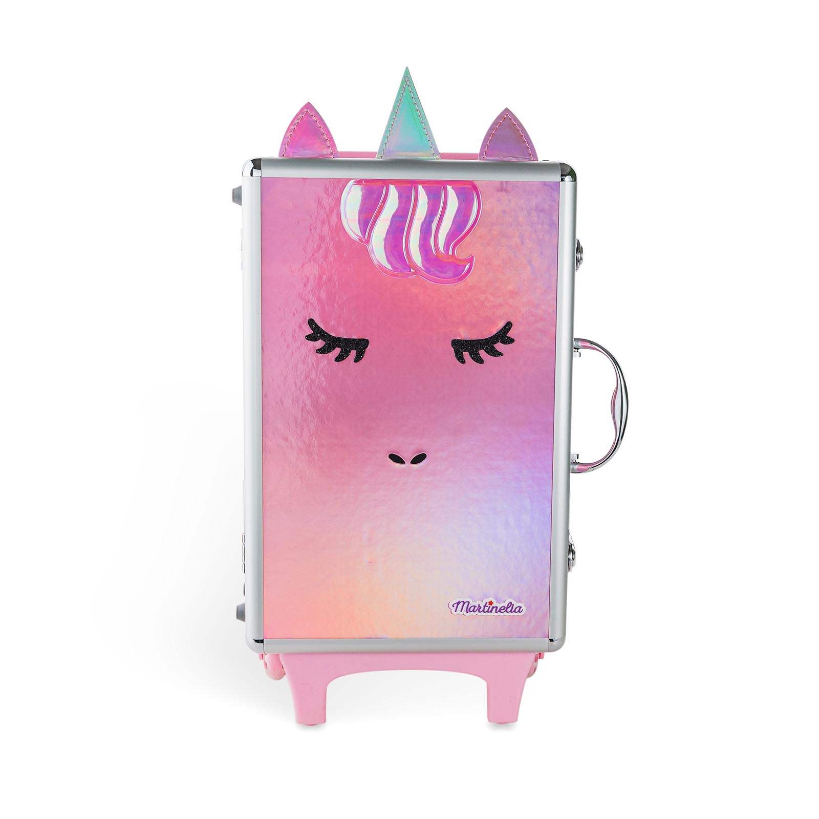 Martinelia Little Unicorn 31111 ― это целый чемодан детской косметики, от которого будет в восторге любая девочка. В этом чемодане просто невероятное количество средств и аксессуаров, с которыми юная модница научится делать первые шаги в макияже и маникюре, экспериментировать и создавать яркие образы. В наборе представлены: 20 оттенков теней, 2 лака для ногтей, стикеры блестящие, пилочка для ногтей, разделитель для пальцев, 2 резинки для волос, 2 аппликатора, 2 кисти для макияжа, 2 оттенка румян, 10 матовых бальзамов для губ, 2 бальзама для губ с блестками, 3 блеска для губ.