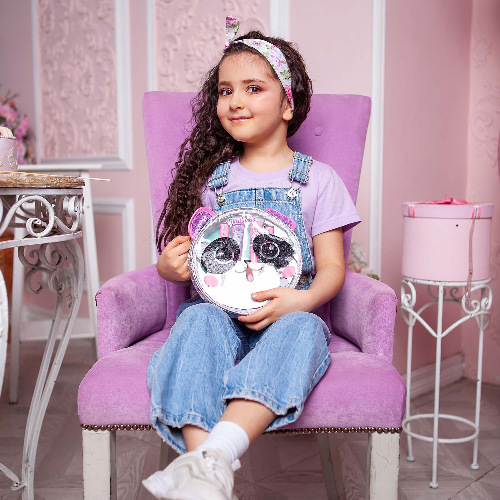 Круглая косметичка сделана из прозрачного силикона. Она закрывается на молнию, а на ее внешней стороне нарисована мордочка панды.